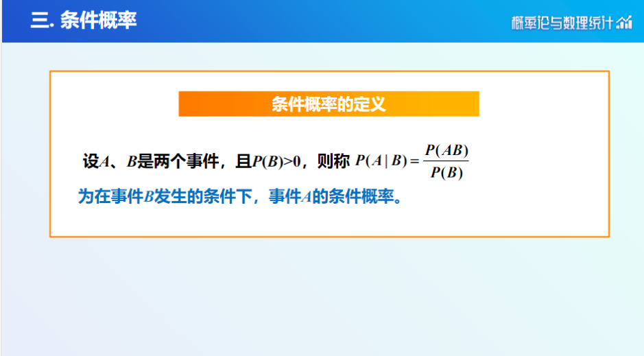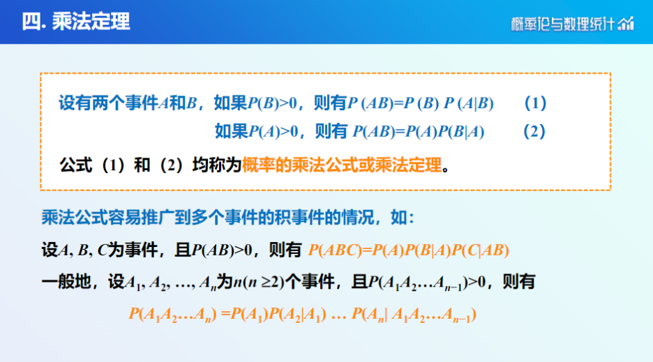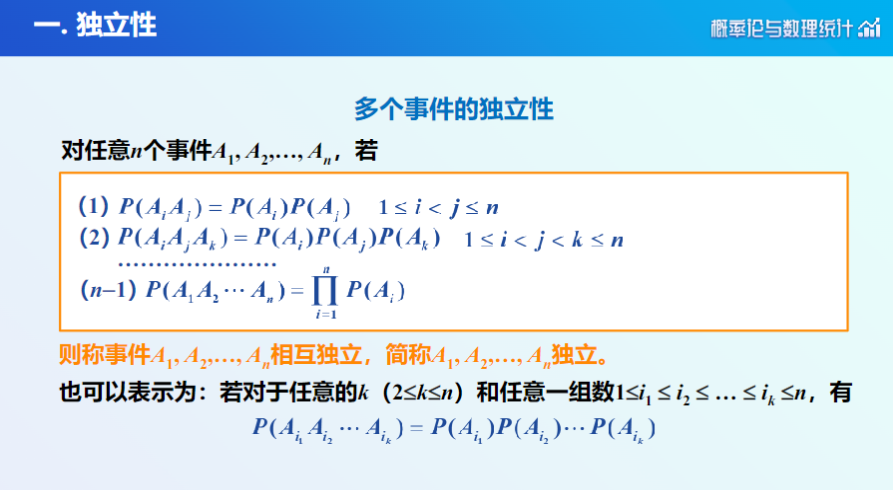 对任意的事件$A$和$B$,若 $P(AB)=P(A)P(B)$,则称事件$A$和$B$是相互独立的。