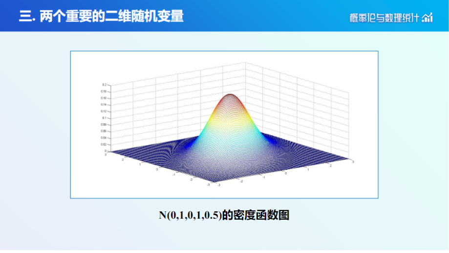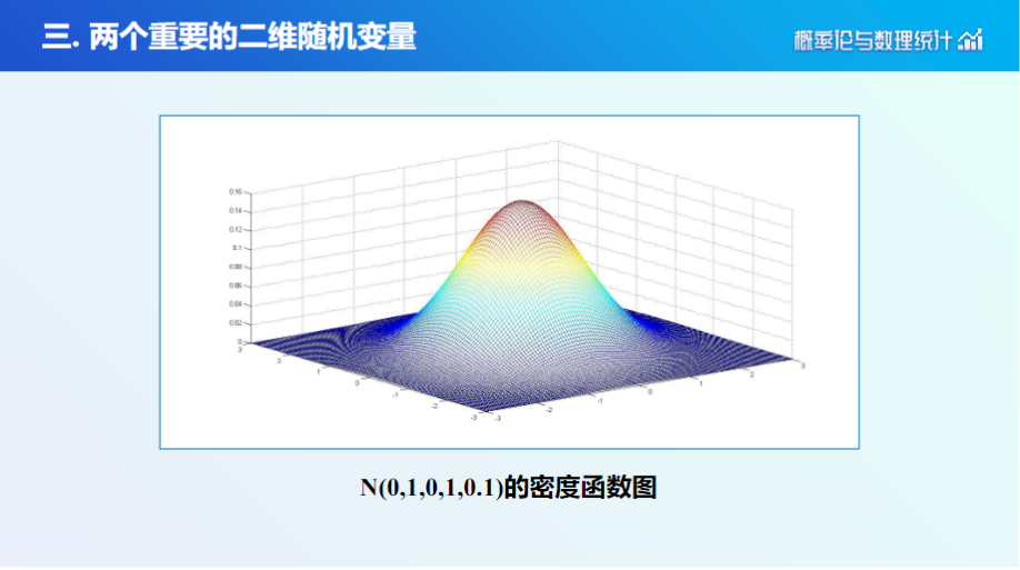 若$(X, Y)$的联合密度函数为 $$ f(x,y) = \frac{1}{2\pi \sigma_{1}\sigma_{2}\sqrt{1-\rho^2}} e^{-\frac{1}{2(1-\rho^2)}\left(\frac{(x-\mu_{1})^2}{\sigma_{1}^2} - \frac{2\rho(x-\mu_{1})(y-\mu_{2})}{\sigma_{1}\sigma_{2}} + \frac{(y-\mu_{2})^2}{\sigma_{2}^2}\right)} $$ 称$(X, Y)$服从二维正态分布,记为$(X, Y) \sim N(\mu_{1}, \sigma_{1}^2, \mu_{2}, \sigma_{2}^2, \rho)$