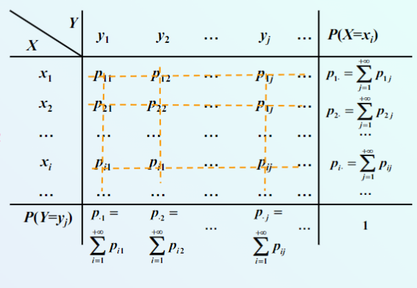 $$F_{X}\left( x \right) = F \left(x, +\infty \right) = \lim_{ y \to +\infty}{F \left( x, y \right) }$$ $$F_{Y}\left( y \right) = F \left(+\infty , y\right) = \lim_{ x \to +\infty}{F \left( x, y \right) }$$ $$P\left\lbrace X = x_{i} \right \rbrace = \sum\limits_{i=1}^{\infty}{p_{ij}} \overset{\triangle}{=} p_{i\cdot}$$ $$P\left\lbrace Y = y_{i} \right \rbrace = \sum\limits_{i=1}^{\infty}{p_{ij}} \overset{\triangle}{=} p_{\cdot j}$$